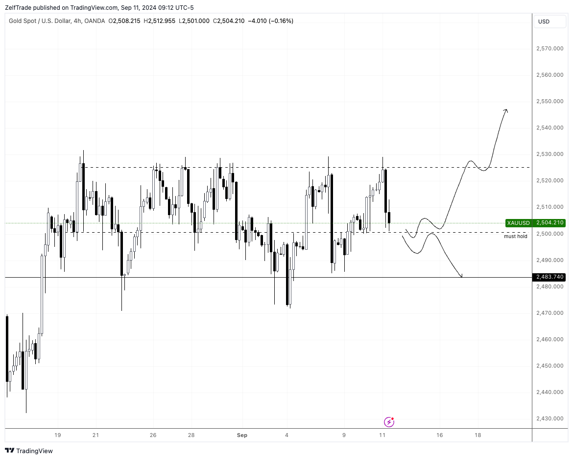 Today’s daily chart close is crucial. We are currently at resistance from previous highs and need a strong price move above $2,530 for bulls to regain control. Must hold level above $2,500's.
